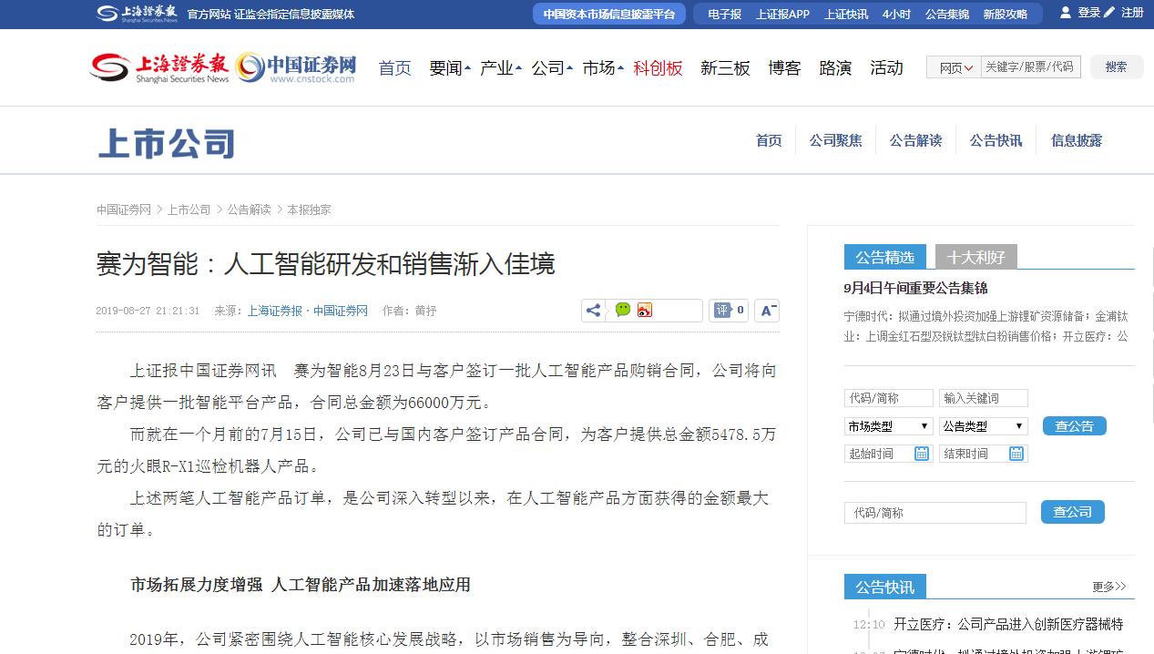 截至7月19日,公司2018年至2019年间签订赛鹰SY950H、SY261H、SY120H等工业级无人机合同3081万元,签订赛为智能火眼R-X1巡检机器人合同7328.5万元;8月23日,签订了人工智能智能平台购销合同66000万元。人脸识别设备销售近400台。其中,近期与客户签订的人工智能智能平台购销合同66000万元,是公司深入转型人工智能以来,在人工智能产品方面获得的单笔金额最大订单。