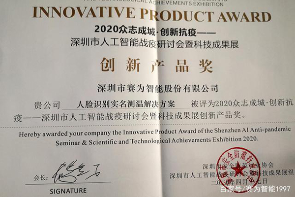 会上,赛为智能人脸识别实名测温解决方案,荣获深圳市人工智能战疫研讨会暨科技成果展创新产品奖。在本次展览上,赛为智能重点展示了由工业级无人机、人脸识别测温一体机组成的立体防控解决方案。