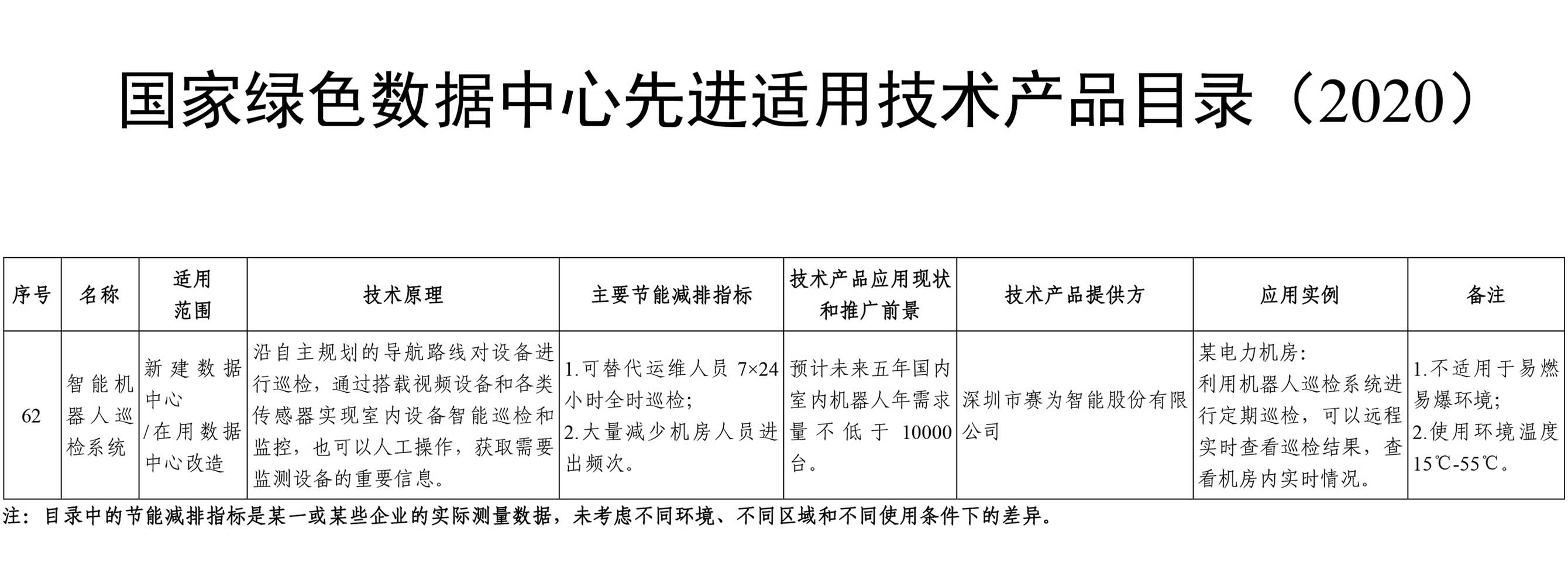 为进一步推动数据中心绿色化建设与改造,推动数据中心节能与绿色发展水平持续提升。日前,工业和信息化部正式公布了三大节能产品目录。其中,赛为智能推出的智能机器人巡检系统技术产品,入选《国家绿色数据中心先进适用技术产品目录(2020)》。