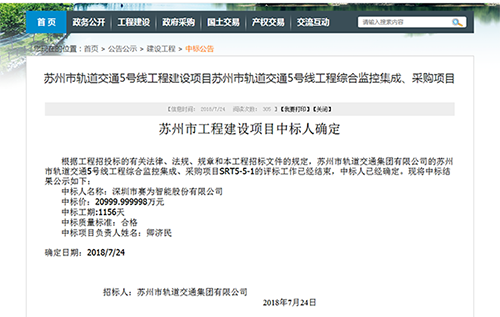 近日,苏州公共资源交易中心发布苏州市轨道交通5号线工程综合监控集成、采购项目中标公告,确认深圳市赛为智能股份有限公司为该项目的中标人,中标金额为20999.999998万元。