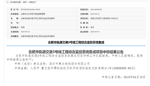 值得一提的是,2018年4月,赛为智能成功中标合肥市轨道交通3号线工程综合监控系统集成项目,中标金额150999999.98元,这也将是赛为智能在合肥参加建设的第三条轨道交通线路。此外,截至5月23日,由赛为智能参加建设的合肥轨道交通1号线、2号线,累计运送客流总量突破1亿人次,各项运行图兑现率超过99.9%,列车正点率高达99.92%。