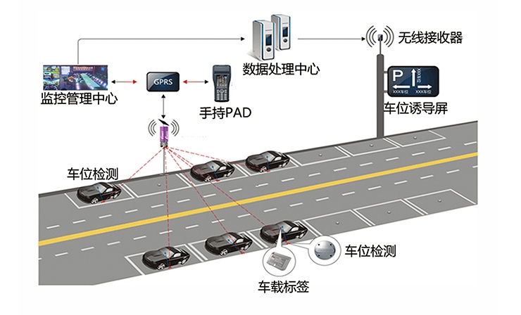 过占道停车管理地磁车位检测系统,采用无线通信技术、物联网技术、计算机网络技术等先进技术手段,实时采集各占道停车场及停放车辆相关信息,通过网络传输至后台中心,对数据进行统一存储、处理。